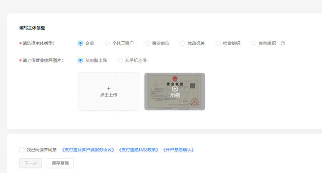 上傳主體證照、填寫主體信息,根據(jù)商戶主體類型(普通企業(yè)、個體工商戶、黨政機關(guān)、事業(yè)單位、社會組織、其他組織)完善主體信息。