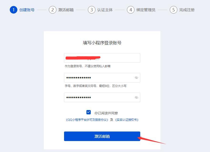 進入小程序登錄賬號注冊頁面,輸入郵箱,密碼,然后點擊激活。
