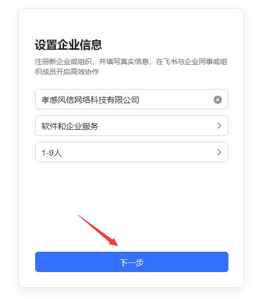進入“設(shè)置企業(yè)信息”界面,填寫真實的企業(yè)名稱,選擇行業(yè)類型、人員規(guī)模,點下一步。