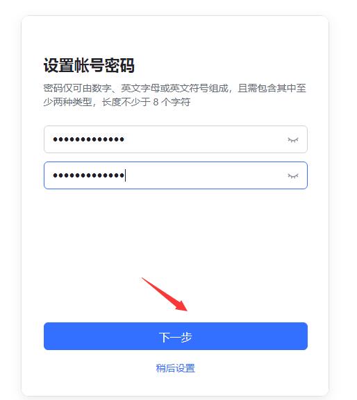 輸入手機驗證碼后,自動進入“設(shè)置帳號密碼”界面,設(shè)置密碼,然后點下一步。
