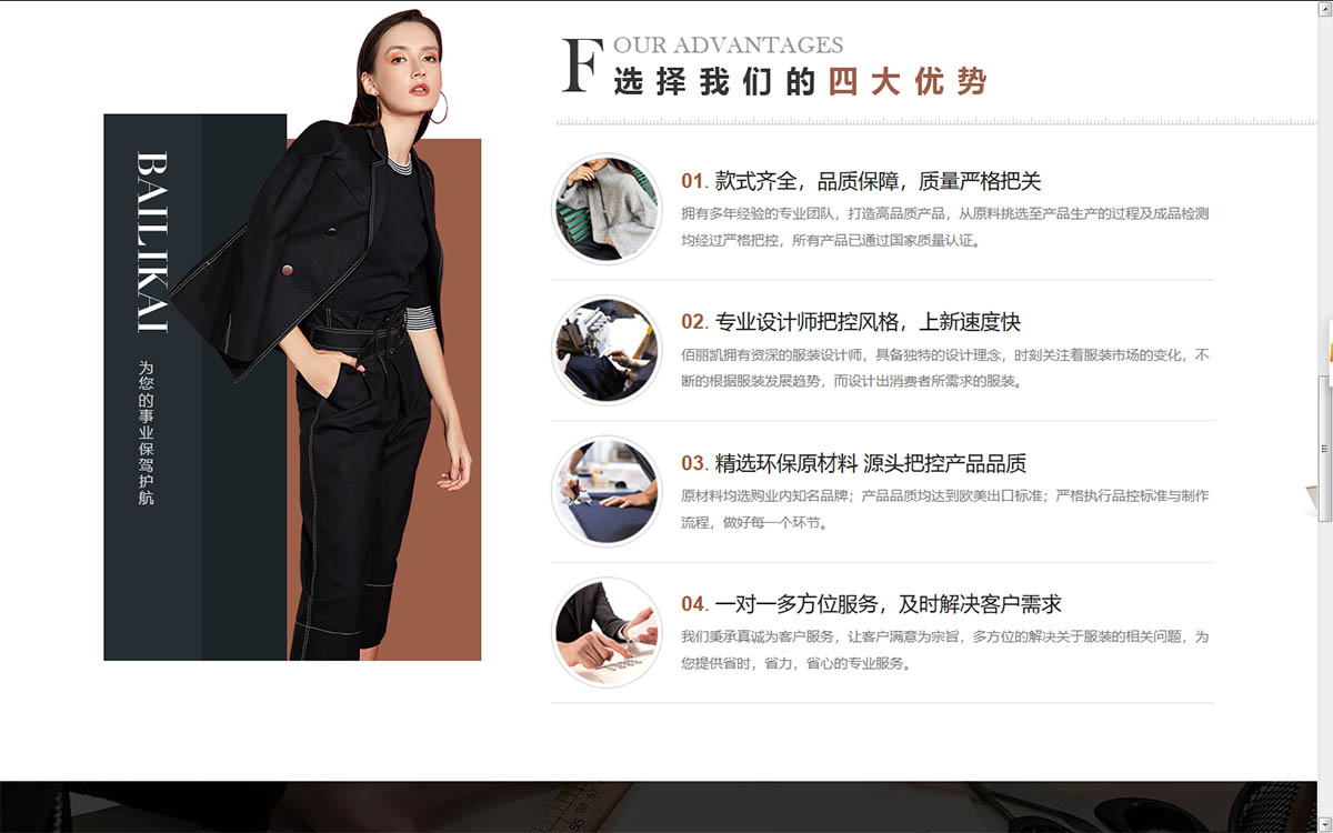 風(fēng)信網(wǎng)絡(luò)響應(yīng)建站某服裝品牌公司致力為現(xiàn)代女性提供時(shí)尚完美生活,巧妙的將各類時(shí)尚元素與東方人的甜美優(yōu)雅氣質(zhì)融合到一起,精選進(jìn)口優(yōu)質(zhì)面料,做工細(xì)膩。